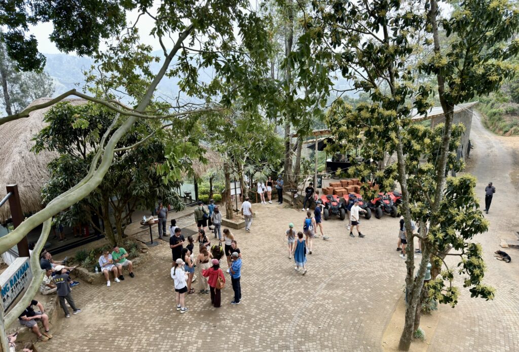 The entrance to the trail to the top had been developed into a commercial activity zone. Ziplines ran across the hillside above me. There was a climbing wall, a rope swing, a bungee setup, and something that appeared to be a paragliding launch point. Loud music came from speakers mounted in the trees. Vendors lined both sides of the path offering everything from juice to elephant rides. This was not a quiet walk up a hill.