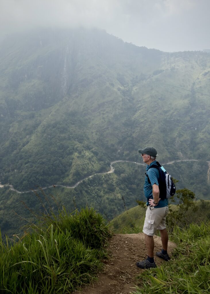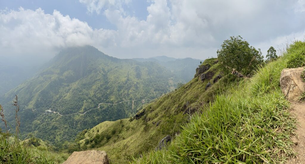 The path above the commercial zone returned to something resembling a proper trail. The summit of Little Adam’s Peak sits at around 1,141 meters and gives a 360-degree view: the Ella Gap cutting through the hills to the south, Ella Rock rising directly opposite, the town of Ella visible below, the tea country stretching away in every direction. On a clear day you can see for a long way. It was not entirely clear, but clear enough. And there was no commercial activity on the top, except for a lone coconut vendor.