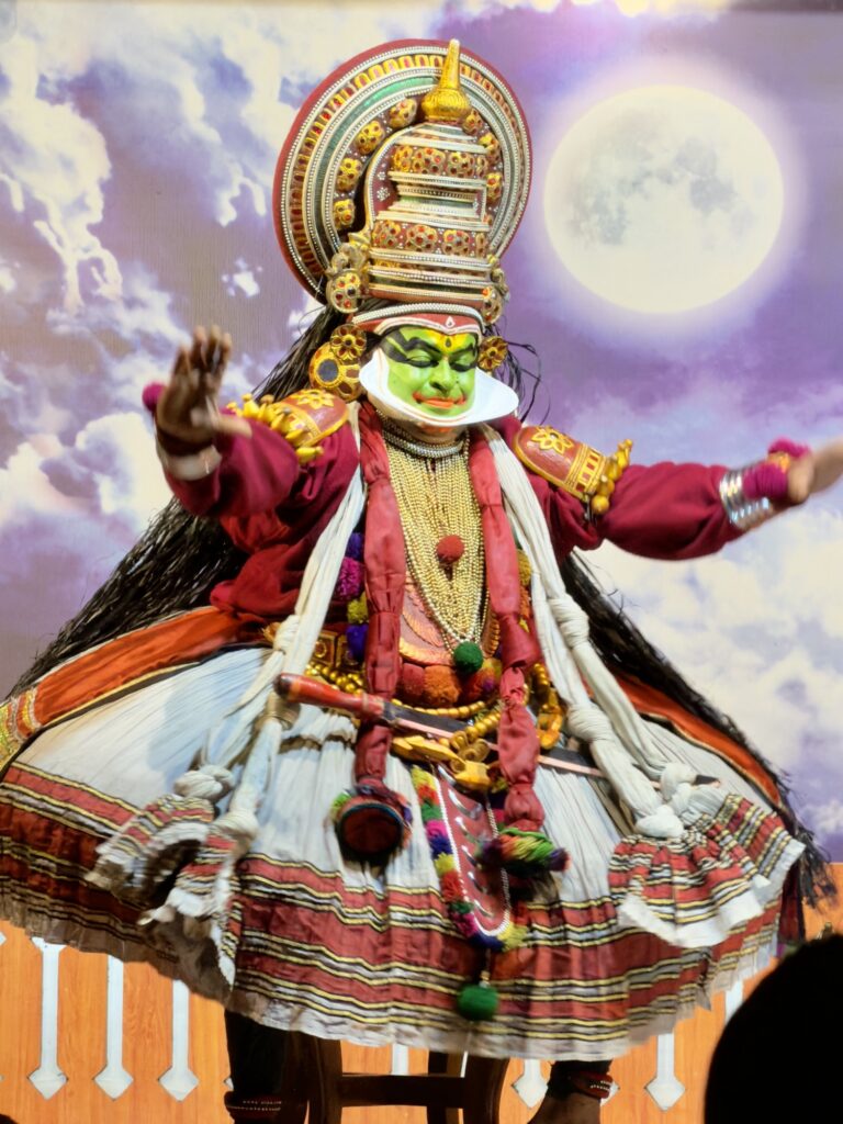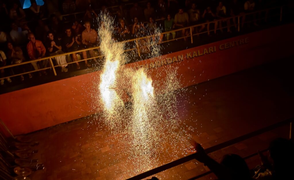 What connects the two forms is not obvious until you know it. Kathakali dancers traditionally trained in Kalaripayattu to develop the strength and physical control their performances required. Seeing both in the same evening, in the right order, makes that connection legible in a way that reading about it does not.