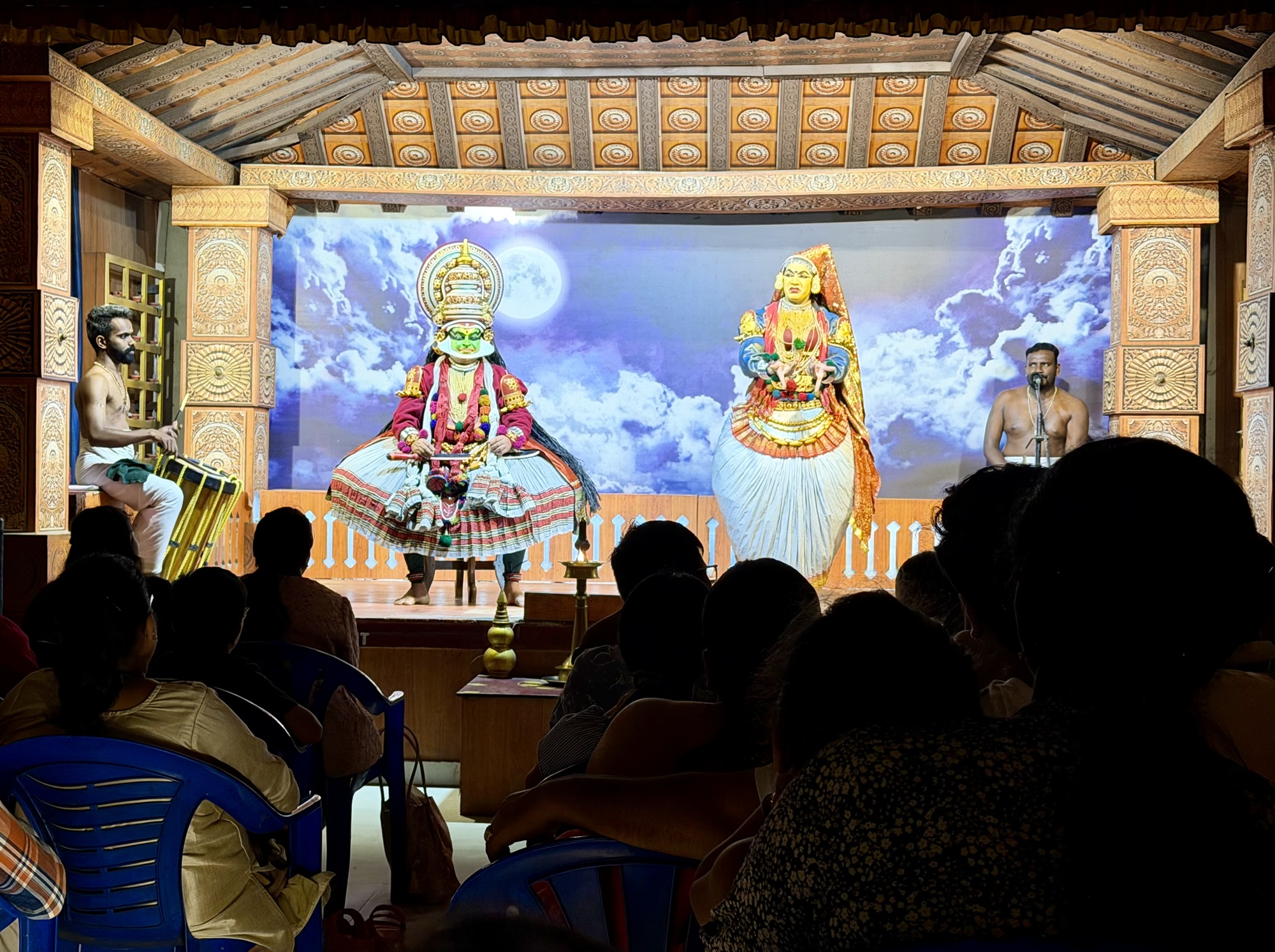 The Kathakali performance followed at 7 PM at the Navarasa Kathakali Centre, a small venue with tiered seating and a low stage. The performers were already in full makeup when the doors opened. The colour palette is limited but specific: green for heroes and divine characters, black for hunters, red and black for demons. The costumes extend the body outward, the headdresses adding half a metre of height, the padded skirts making each gesture feel monumental.