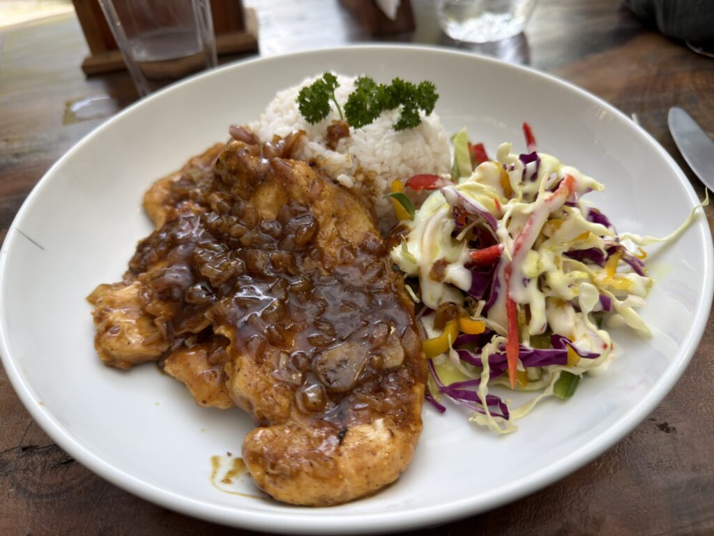 The walk back up to the main road was, as anticipated, uphill. Not strenuous by any objective measure, but noticeable after the previous day. I found a restaurant on the main street and sat down for teriyaki chicken, which bore no particular relation to teriyaki as I understand it but was hot and good. A satisfactory lunch.