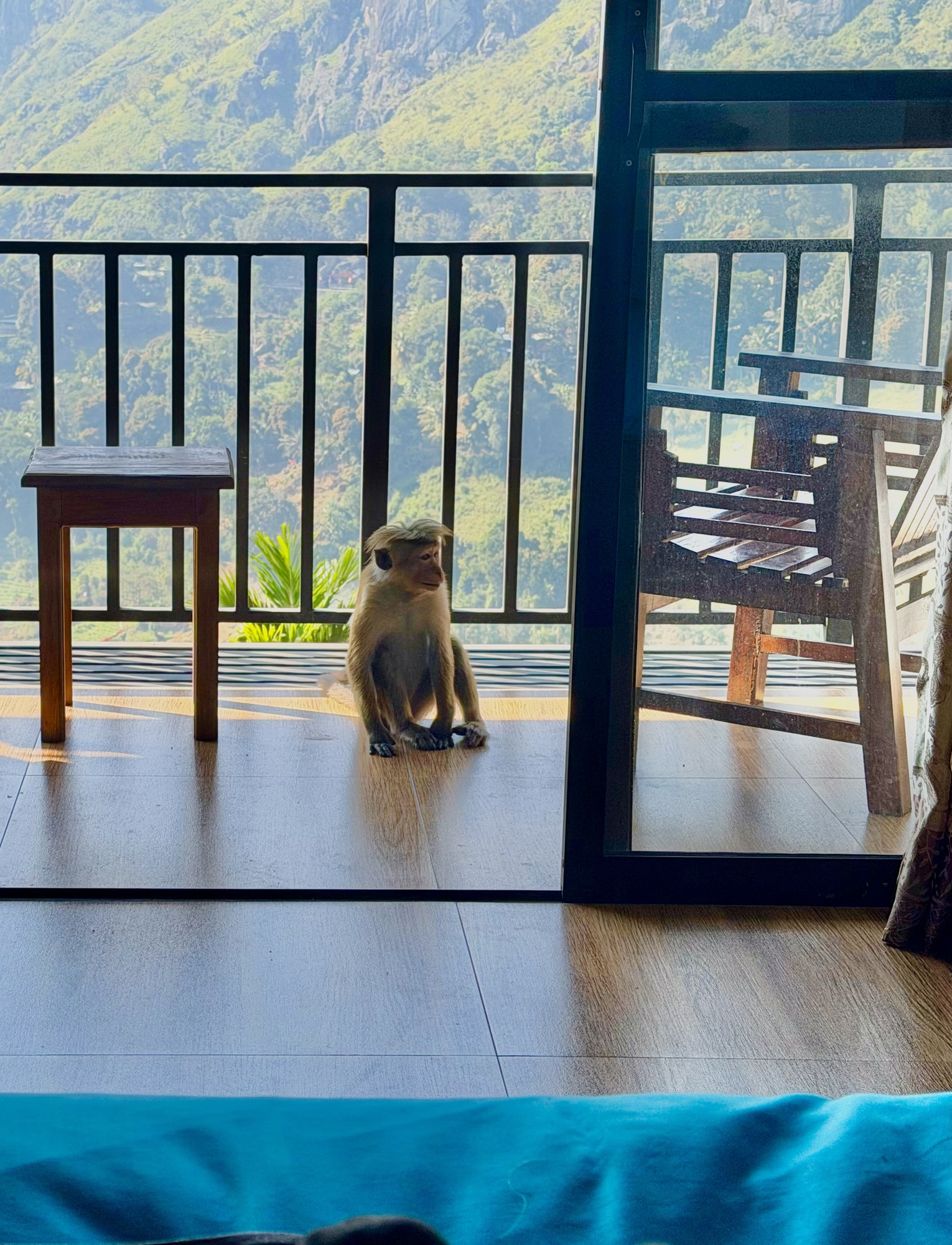 Breakfast was coffee, toast, and coconut wraps on the balcony. Then I packed, said goodbye to the room and the monkeys, and headed down to wait for the taxi.